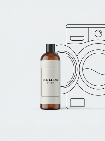 俯视角构图,一台棱角分明的哑光白滚筒洗衣机静置于深邃的午夜蓝渐变背景中,舱门以45度角优雅敞开,露出内部如精密齿轮般交错的银色不锈钢内筒,波浪形洗衣槽在侧逆光下形成明暗交错的几何阴影。顶部控制面板采用悬浮式设计,圆形旋钮泛着冷调金属光泽,LED显示屏正投射出幽蓝的数据光芒,按键排列如琴键般富有韵律感。洗衣机底部与光滑的液态银地面无缝相接,形成完美对称的倒影,地面反射着内筒的机械纹路与控制面板的点点蓝光。整体光线采用三点打光法:主光源勾勒出洗衣机锐利的轮廓线,辅助光凸显哑光与金属的材质对比,背光在背景墙投射出微妙的光晕渐变,营造出未来实验室般的科技静谧感,高清晰度捕捉每一处接缝的精密工艺。