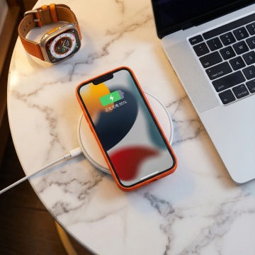 一张现代简约风格的手机充电状态展示图,居中放置一部亮黑色智能手机,屏幕点亮显示深黑色背景,中央有一个醒目的绿色圆形充电图标,图标内有白色闪电符号,背景伴有柔和的蓝色光晕和模糊的圆形渐变纹理,手机底部连接着一根白色的充电线,整体画面简洁、科技感十足,光影效果细腻,色彩对比鲜明,突出手机正在充电的核心状态,视觉焦点明确,信息传达清晰直观。