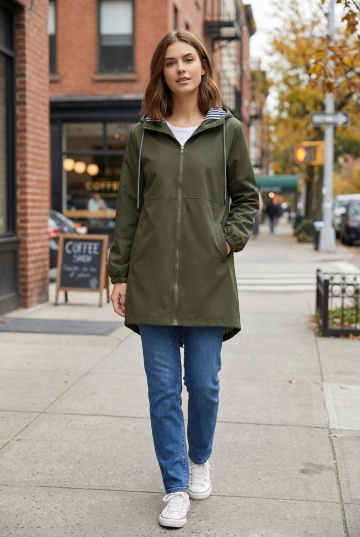 一位女性迎着晨光,轻松自信地走在城市街道上