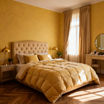 一张现代简约风格的卧室设计图,整体色调为温暖的米白色和浅木色,搭配柔和的自然光线从大窗户洒入,营造出宁静舒适的氛围。房间内有一张铺着白色条纹床单的双人床,床头摆放着简约的床头柜和台灯,床尾处铺着一张米白色的地毯。房间的另一侧是一个白色的梳妆台,上面摆放着一些绿植和装饰品。墙面采用了简约的线条设计,整体空间布局合理,家具摆放整齐有序。