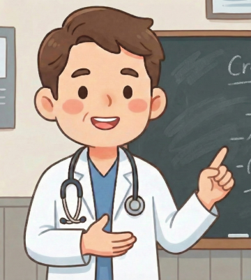 扁平风格卡通医生插画,戴着圆形眼镜,黑色短发,面带微笑,穿着白色医生大褂,内搭蓝色衬衫和领带,脖子上挂着听诊器,双臂交叉在胸前,整体采用简洁明快的线条,色彩鲜明柔和,无背景,形象亲切专业。