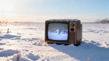 漫天雪地,张灯结彩的新年风格,不要中国风格,雪地上有一个高清电视机