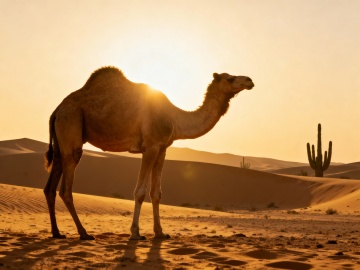 剪影风沙漠日落,驼队行于沙丘,枯树伫立,光影交织如油画,静谧中透出实景感。