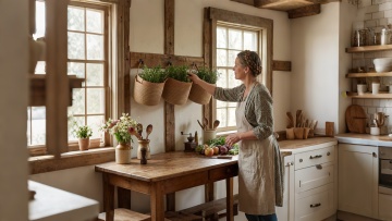 阳光明媚的花园露台餐厅,原木色方形餐桌搭配藤编靠背餐椅,桌面上摆放着白色陶瓷餐具和插满粉色玫瑰的玻璃花瓶,四周被茂密的绿植和盛开的花卉环绕,顶部悬挂着造型简约的白色布艺吊灯,地面铺设浅色防滑地砖,远处可见木质围栏和蓝天白云,整体呈现出清新自然、温馨舒适的田园风格,光线明亮柔和,营造出轻松愉悦的用餐氛围。