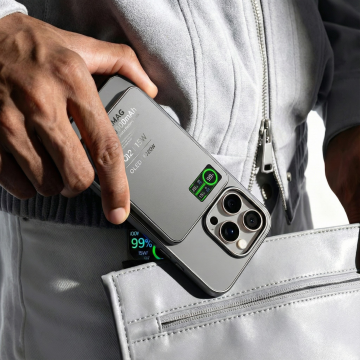 一张智能手机的产品展示渲染图,手机以略微倾斜的角度放置在纯白色背景上,银色金属边框,正面屏幕显示深邃的渐变色彩,上方是明亮的蓝色渐变圆形图案,下方是从深黑过渡到淡粉色的渐变圆形图案,整体呈现出极简、科技感、高端、清晰、光滑的3D渲染风格,光影效果柔和,突出手机的轻薄机身和流畅线条。
