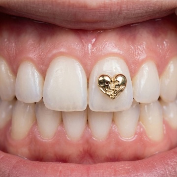 图片中饰品原图粘接到牙齿表面,生成一张电商头图,不要文字
