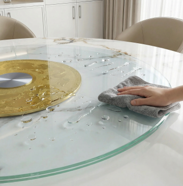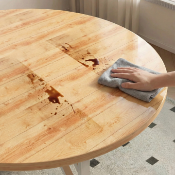 这是一条清洁布,生成一张正在擦拭桌子上面水渍的场景图,场景要明亮温馨,最好有绿植