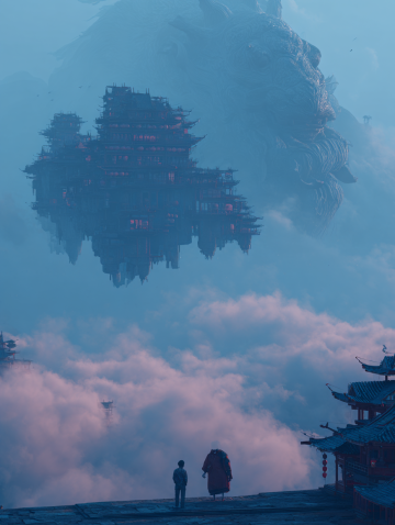 梦幻古典中式插画,仙人御剑飞行,云海缭绕,水墨风格渲染虚拟现实。