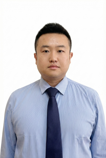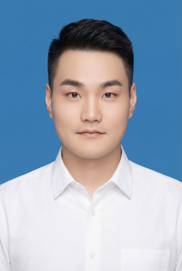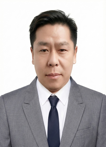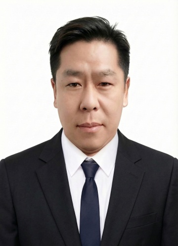 政务感与商务感兼具的单色设计风肖像,金属质感细节强化专业气质,蓝色背景凸显正式与权威,实景拍摄呈现真实庄重氛围。