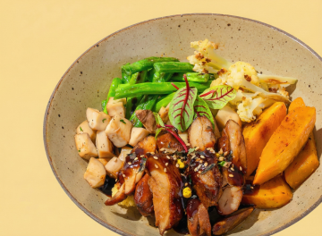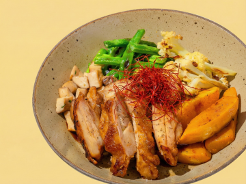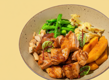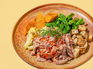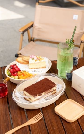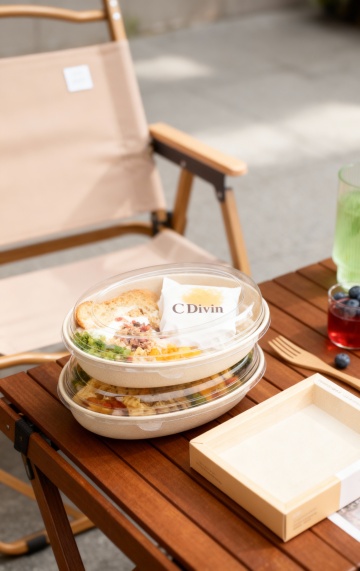 这是一个打包盒的场景图,我想保持打包盒和打包盒内物品不变,只改变背景:这张图是食品包装的产品展示图,整体氛围清新且注重材质安全性,以深棕色木质桌面为核心,桌子上有打包盒和咖啡细节丰富且氛围松弛.背景是模糊的户外 / 半户外场景:能看到浅棕色帆布材质的折叠椅、灰色地面,光线柔和自然。