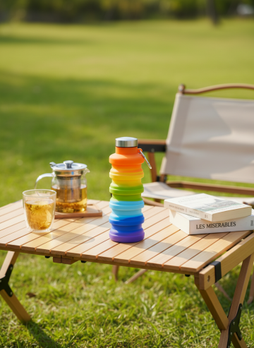 清新自然的户外场景,彩虹色折叠水瓶置于木质桌面上,搭配茶具与书籍,轻拟物风与木雕质感结合,营造舒适惬意的野餐氛围。