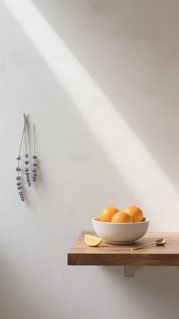 极简主义厨房场景,大面积留白占画面60%,柔和天光从左上45度角斜切而入,在浅灰色水泥墙面上形成流动的几何光影。右下角原木色悬浮台面仅占画面底部五分之一,台面上单个哑光白瓷碗盛着三颗渐变橙黄的柑橘,碗沿搭着半片柠檬皮。左侧墙面垂落三串风干薰衣草,右下角台面边缘露出半截黄铜量勺。整体采用低饱和度的米白、原木棕与雾灰,浅景深处理使背景虚化,营造空寂而温暖的禅意氛围,适合作为极简风格背景使用。