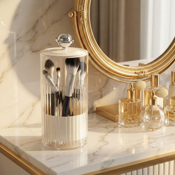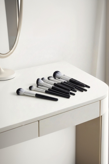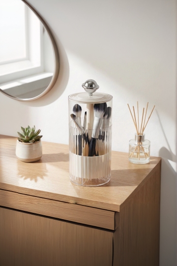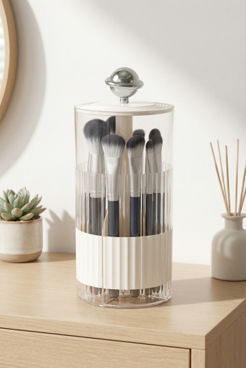 极简高端美妆产品集合海报,六个完全不同的美妆元素规整排布于纯白色纯色背景上,保持高清写实摄影风格,光线明亮柔和,物体表面有细腻高光与轻微阴影,展现透明玻璃与精致塑料的质感。元素包括:左上角为方形透明玻璃面霜瓶配银色金属盖,标签简约;右上角是圆柱形白色乳液瓶带按压泵头;中间左侧为长方体磨砂玻璃精华液瓶;中间右侧是黑色皮质化妆包带金色拉链;左下角为三支不同尺寸的化妆刷套装,刷毛柔软呈浅棕色;右下角为圆形透明唇釉管体。所有物体间距均匀,构图对称平衡,整体传达优雅、高端、专业的美妆产品氛围,无任何文字、LOGO、二维码及多余信息。