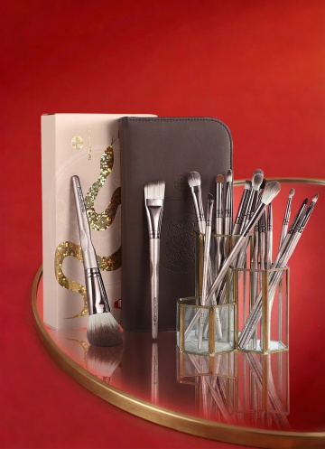 超写实3D渲染风格,纯白纯色背景,高光泽金属质感与细腻膏体纹理,光影效果为顶部斜射柔光形成明显高光与渐变阴影,六个化妆品元素规整排布组成系列集合:金色瓶盖黑色瓶身的香水、透明菱形切割面的粉底液瓶、带金色装饰的黑色睫毛膏管、玫瑰金色外壳的腮红刷、方形黑色眼影盘配金色边框、圆柱形高光修容棒,每个元素均保持与原图一致的高反光材质、精致细节刻画和45度角倾斜摆放,整体构图对称平衡,色彩以黑金色为主色调搭配产品本身色彩点缀,营造高端奢华的化妆品系列视觉效果。