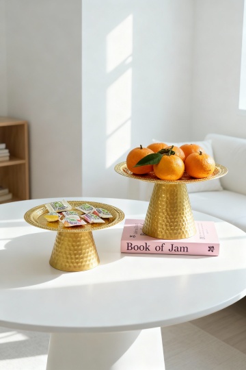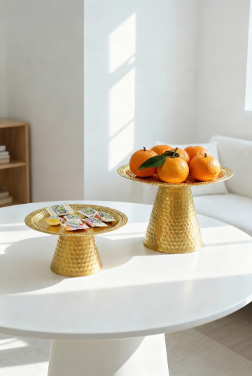 一张极简风格的产品展示图,主体为一件造型简约优雅的圆形台面家具(或类似产品),台面材质改为光滑细腻的哑光白色陶瓷,边缘呈现柔和的弧形过渡,底部搭配纤细的黄铜金属支架,支架设计为交叉几何造型,整体线条流畅现代。背景替换为纯净的浅米色,光线从左上方45度角柔和照射,在产品表面形成自然的高光和细腻的阴影,台面中央有轻微的反光效果,凸显材质的温润质感与高级感,整个画面构图采用经典的三分法,产品位于画面中央偏下位置,底部接触深色沉稳的地面,营造出宁静、精致且具有现代设计感的氛围。