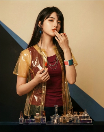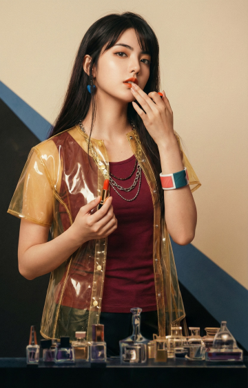 请把左图人物的面部特征替换到右图上面去。发型、衣服和姿势与右图保持一致。写实摄影风格,女性,黑色长发,涂橙红色口红的动作,身穿透明短袖外套(半透明的泛黄塑料材质—— 质感像略微旧化的 PVC 薄膜,表面带着柔和的朦胧光泽,不是高亮的塑料反光,而是被时间晕染出的暖调黄感通透感。塑料的半透特性让内里的红色内搭无法被完全遮挡:浓郁的正红色透过这层泛黄的塑料介质,被黄色调自然中和,最终在外套的覆盖区域呈现出暖而饱和的橘红色) + 酒红色内搭,佩戴多层项链、蓝色耳环、腕带,深色的裤子。背景是秀场的背景的几何色块,刚好是秀场灯光特有的布局感 —— 浅米色区域像柔光灯铺洒出的明亮场域,是秀场后台补妆区被灯光温柔打亮的空间;而深蓝与黑色的利落色块,则是秀场追光 / 区域灯边缘的暗调边界,线条干脆的色块拼接,复刻了秀场 “明暗分区、对比强烈” 的舞台光效,像后台上方的灯光装置,既清晰划分出视觉焦点区,又带着秀场特有的精致冷感。画面下方排列的香水瓶,此刻像秀场展示台的陈列单品,被背景的灯光(浅米色亮区)衬得泛着冷调光泽,和灯光色块的明暗节奏呼应,让整个画面像 “秀场后台准备登场前的补妆时刻”—— 背景的灯光正等着聚焦到她身上复古怀旧色调,整体呈现复古怀旧的80年代东京质感,写实摄影风格;复古明亮的色调,电影级打光,高细节写实风格,带有轻微的胶片颗粒质感,光线柔和均匀,充满怀旧日系杂志封面的质感,高清,4k画质