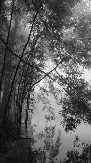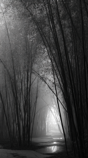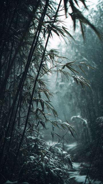 1. 俯拍构图,一株修长翠竹以对角线姿态划破纯黑背景,竹节处凝结着银白色霜花,深墨绿色竹叶边缘泛着冷光,部分叶片垂落形成优雅弧线,光线从左上方45度角切入投下细长阴影,凸显竹竿粗糙纹理与霜花的晶体质感。