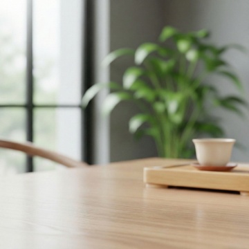 古朴雅致的中式书房场景,暖棕色调木质背景墙,右侧圆形镂空窗格投下斑驳光影,左侧有翠绿植物枝叶自然垂落,桌面上摆放着一个青瓷茶具套装,包括盖碗、公道杯和品茗杯,旁边放着一小罐茶叶和一个竹制茶则,整体光线柔和,营造出宁静悠远的东方禅意氛围,细节精致,质感温润,具有高度写实的摄影风格,突出传统器物的古朴韵味与自然肌理。