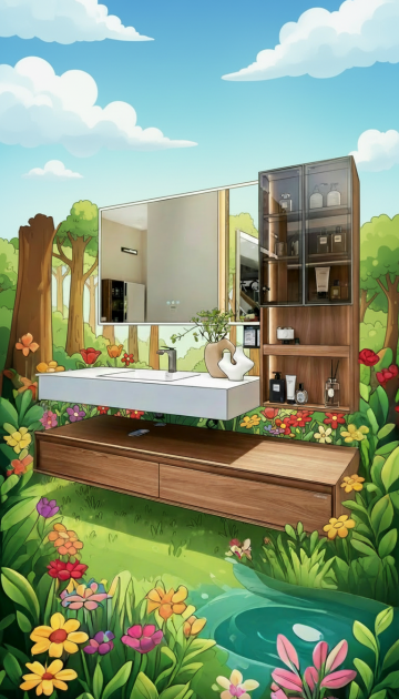 参照图中动漫画风,生成简约现代洗手间,在洗漱台前,画面不要出现人物