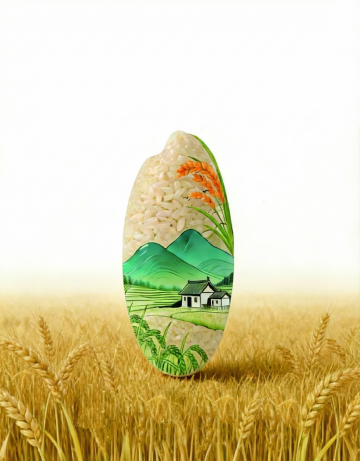 一张以大米为主题的食品摄影风格图片,画面中央是一小堆饱满洁白、颗粒分明的大米,米粒表面泛着自然的光泽,质感细腻真实。大米堆置于铺散着金黄色麦穗的浅色木质桌面上,麦穗呈现出成熟的暖黄色,穗芒清晰可见,部分麦穗自然垂落在桌面边缘。背景为柔和的米黄色渐变,光线从画面上方偏右位置轻柔洒下,形成明亮的高光区域,为大米和麦穗镀上一层温暖的光晕,阴影部分过渡自然柔和,整体营造出温馨、质朴、丰收的氛围。画面左侧后方有一个浅棕色的木质小碗,碗口朝左,与右侧的麦穗形成对称平衡,构图采用经典的三分法,主体突出,细节丰富,色彩以米白、金黄、浅棕为主,和谐统一,给人以纯净、天然、高品质的视觉感受。