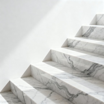 极简主义风格的白色大理石台阶,台阶表面带有自然流畅的灰色大理石纹路,呈现出细腻的石材质感和温润光泽,整体呈阶梯状向上延伸,构图采用对称美学和简洁的几何形态,光线从上方柔和照射,在台阶边缘形成轻微的阴影过渡,背景为纯白色,营造出干净、现代、高端的氛围,突出大理石材质的天然纹理和层次感。