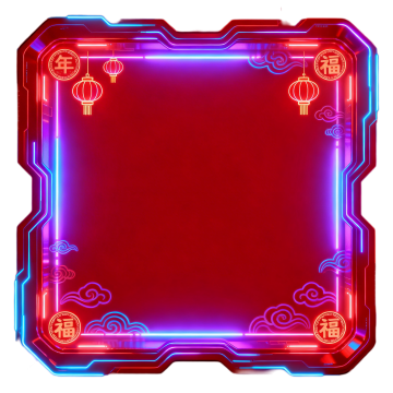 国潮风格背景,以正红色为底,金色线条勾勒的不规则八边形主框架,框架内为纯白色留白区域,右上角装饰有盛开的金色牡丹图案,左下角有一个圆形红色装饰,底部有一条蓝绿色的云纹装饰带,整体呈现出喜庆、典雅的传统中国风,线条流畅,色彩对比鲜明,充满节日氛围和文化底蕴。