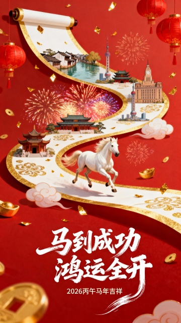 软3D风卡通小马跃动,鎏金“2026”闪耀,粒子光效迸发喜庆感,红紫渐变背景搭配金币元素,传递新年暴富暴美暴瘦的可爱祝福。