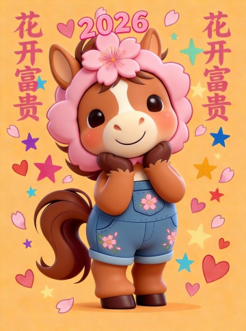 本形象以“Q版招财马”为核心,突破传统严肃的生肖表达,融入现代卡通美学与吉祥文化符号。小马表情亲和,形态圆润,结合“金币、红包、福字、橘子、舞狮”等新春元素,突出“招财进宝、福气满满”的轻松主题。视觉上采用3D柔和渲染与温暖色调,兼具文化感与商业亲和力