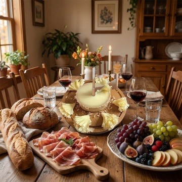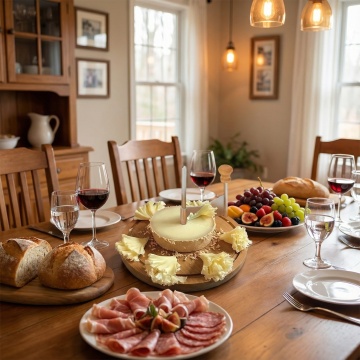 生成一张在西方家庭的餐桌上放着图片里的削芝士的机器,桌子上旁边还放着面包等美食