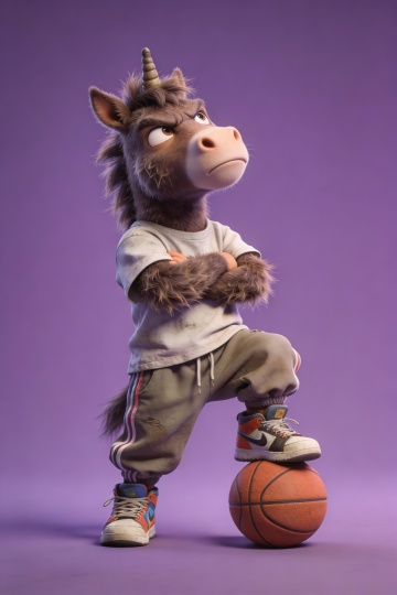 卡通感十足的拟人化小驴,软3D风格呈现毛发生长细节,身穿休闲装踩篮球,展现潮流与趣味结合的节日创意。