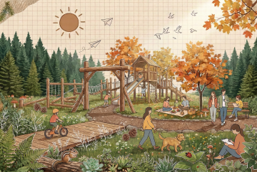清新插画风,卡通人物与狗狗拟人化探险,背景雪山湖景,充满自然生机。