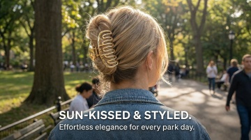 以图中的金属爪夹发饰为元素,欧美女人在日常生活中,后脑勺盘发,物体主体特征不变,设计6张跟金属爪夹发饰有关的广告图,英语,比例 「16:9」