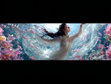 梦幻古典中式插画,超现实主义风格,童子仰望飞天,书卷流转,水墨液态风。