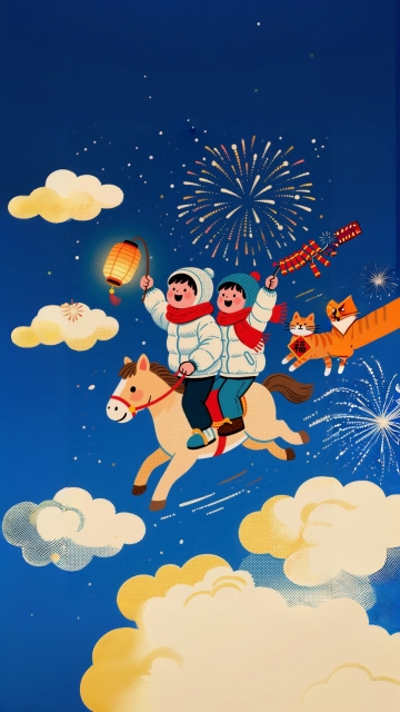 软3D风拟人小马,身着国潮红金唐装,手持灯笼立于祥云,夜市烟花映衬,喜庆卡通感十足,2026马年大吉。