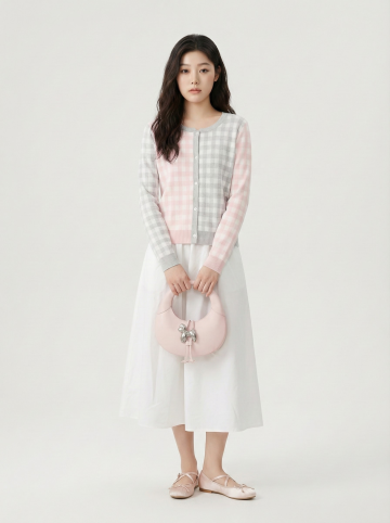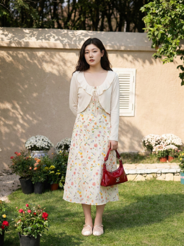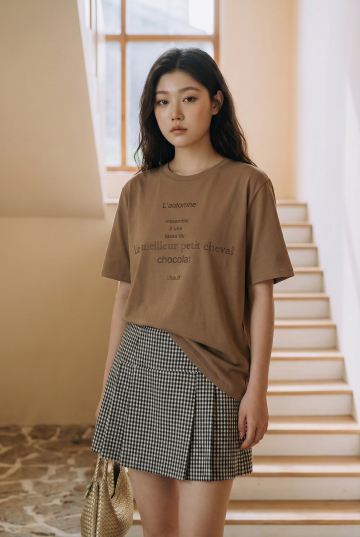 上身穿着看得见而不被下装遮盖的oversize 服装,让衣物保持自然垂坠的状态,不要把它们掖进裙子里,材质层:柔光激活面部 毛孔纹理 清晰呈现图案且保留布料纹理;摄影参数:85mm f2.0 定焦镜头,iso100,快门 1/200s,画面干净通透,主体细节真实自然,模特占比30%