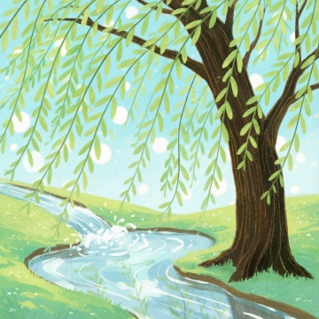 水墨风与工笔结合,柳枝鎏金点缀,飞鸟掠过朦胧山水,清新柔和,尽显中式意境之美。