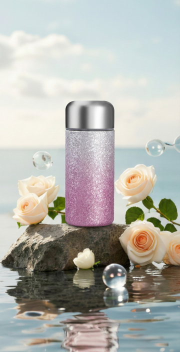 清新梦幻的3D风格水杯,融合轻拟物与水彩质感,置于虚拟自然中,粉色丝带图案点缀,营造唯美治愈氛围。