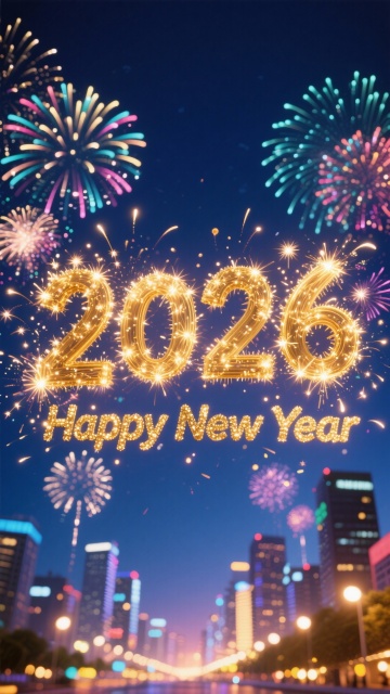 画面中央是金色烟花字“2026”,下方搭配金色烟花英文 “Happy New Year”,背景是深蓝色夜空,布满色彩绚烂的烟花,底部还有城市夜景的灯光光斑