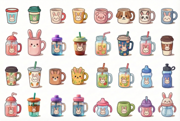 一系列6个造型各异的卡通风格咖啡杯插画,保持咖啡杯主体内容,采用规整的网格排布在浅色背景上。每个咖啡杯拥有独特造型:1. 复古花纹陶瓷杯配金色杯碟,暖棕色系;2. 未来感流线型保温杯,银灰与亮蓝渐变;3. 手绘风格马克杯带可爱动物耳朵,粉白配色;4. 简约几何造型玻璃杯,透明质感配绿色吸管;5. 波西米亚风编织杯套纸杯,多彩条纹图案;6. 日式和风茶杯配木质托盘,米白与深棕搭配。所有杯子均保持圆润卡通轮廓,简洁线条,扁平化设计,色彩明快,整体形成和谐统一又各具特色的系列感。