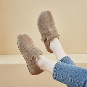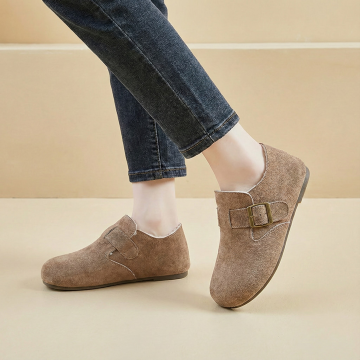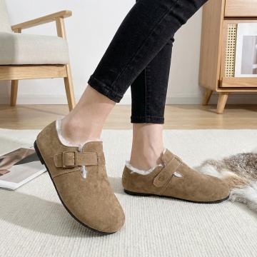 构图: 正方形画布,产品采用对角线构图,一只鞋在前(左下区域),一只鞋略靠后在上方,形成前后错落感。产品整体占据画面约60%。 视觉焦点: 左下角的前鞋为主视觉点,鞋口朝向画面中心,确保能清晰看到鞋款完整外观与内部的毛绒内里细节。 背景与光线: 浅米色或浅灰色哑光背景纸,左侧窗边自然光模拟,光线柔和,在鞋面产生细腻的明暗过渡,突出皮革质感与毛绒的柔软。 元素与留白: 画面极其干净,无任何多余装饰。在左下角主鞋下方预留明显空白区域,用于您添加“送赠品”文字和小图标。 画面感觉: 安静、聚焦、充满细节质感,让人第一眼就能感受到产品的材质与工艺。