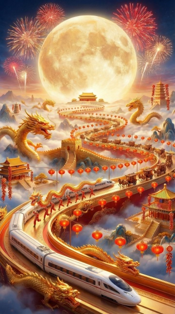 剪纸风与国潮风融合,撕纸艺术呈现中式门框内的梦幻夜景,高铁与火箭共现,喜庆烟花映衬满月,科技感与传统元素交织,超现实主义展现节日新貌。