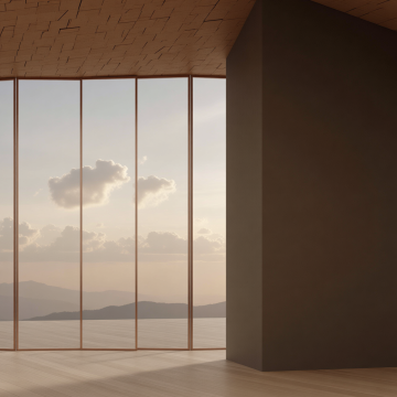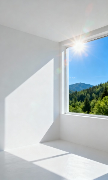 超写实3D渲染风格室内场景,极简主义设计,木质边框的推拉窗,部分磨砂玻璃与透明玻璃结合,窗外是晴朗蓝天与远处的山脉轮廓,窗台下有绿色草坪,室内地面为浅色平滑材质,一侧有木质墙面,自然光从窗户洒入形成柔和光影,营造宁静、通透、自然的氛围,不同角度、场景、布置的窗户设计,包括从室内望向窗外的视角、窗户开启状态的变化、搭配不同室内装饰元素(如简约家具、绿植、水景)的窗户布置,保持原木色与白色为主的柔和色调,强调材质的细腻质感与光影的自然过渡,整体画面干净整洁,空间感强。