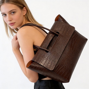 现代感皮质托特包,简约主义设计,光影交错凸显质感,商务与优雅并存,重拟物风实景呈现,时尚大气。
