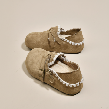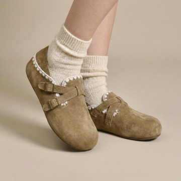 构图: 正方形画布,产品采用对角线构图,一只鞋在前(左下区域),一只鞋略靠后在上方,形成前后错落感。产品整体占据画面约60%。 视觉焦点: 左下角的前鞋为主视觉点,鞋口朝向画面中心,确保能清晰看到鞋款完整外观与内部的毛绒内里细节。 背景与光线: 浅米色或浅灰色哑光背景纸,左侧窗边自然光模拟,光线柔和,在鞋面产生细腻的明暗过渡,突出皮革质感与毛绒的柔软。 元素与留白: 画面极其干净,无任何多余装饰。在左下角主鞋下方预留明显空白区域,用于您添加“送赠品”文字和小图标。 画面感觉: 安静、聚焦、充满细节质感,让人第一眼就能感受到产品的材质与工艺。