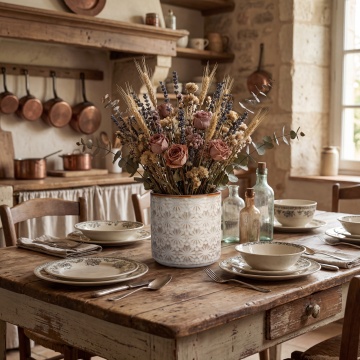明亮温馨的厨房场景,淡黄色墙面,柔和自然光从左侧窗户洒入形成温暖光影,木质台面与白色柜门搭配,上层木质搁板摆放白色带盖糖罐、白色茶壶、带盖白色大碗、透明玻璃瓶,下层台面上有木质面包板、白色小碗、插着红黄白小花的白色陶瓷花瓶、透明玻璃小花瓶,整体呈现简约北欧风格,色彩清新明快,氛围舒适居家,细节精致,构图平衡,质感真实。