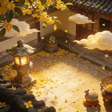 竖构图,宋代水墨风格工笔重彩,深秋的江南古刹后院,画面中央是半月形的青石板浅滩,倒映着斜斜掠过的丹枫枝桠,形成破碎却灵动的对称。前景是青苔斑驳的青灰色石阶,不规则的积水洼中沉着几片朱砂色枫叶,边缘泛着冷银色的反光。背景是几株千年银杏,金黄扇形叶片在黛色瓦檐间簌簌飘落,晨雾带着淡青色从飞檐斗拱间漫出,与初升朝阳的暖金交织成缥缈的光幕。左侧一株老梅虬曲的枝干斜插入画,墨色枝干上已缀着几点含苞待放的胭脂红。整体色调以靛青、赭石、泥金为主,笔触既有工笔的细腻勾勒,又有水墨的氤氲晕染,宣纸纹理间透出古旧的绢黄色,垂直的银杏树干与水平的浅滩倒影形成禅意的几何对比,营造出"空山新雨后,天气晚来秋"的空灵意境。