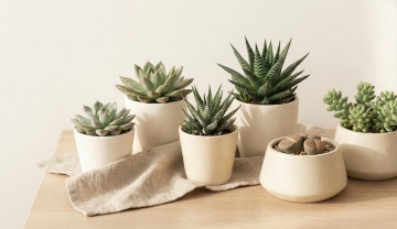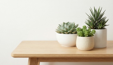极简主义风格的厨房台面特写,柔和的蓝灰色调,木质纹理的浅色桌面,前景摆放着一个白色小花盆,里面插着一朵鲜艳的黄色花朵,背景是干净的白色橱柜和带有磨砂质感的窗户,窗台上整齐排列着白色陶瓷罐和装有黄色小花的花瓶,整体画面呈现出宁静、整洁、现代的北欧氛围,光线柔和,阴影细腻,色调统一和谐,营造出舒适放松的居家环境。