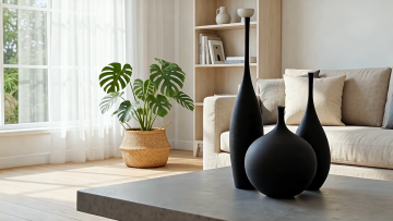 俯视角构图,现代北欧风格厨房转角区域,晨光斜切过哑光白瓷砖墙面形成几何光影图案,浅橡木色台面与嵌入式白色抽屉柜呈L型衔接。右侧墙面安装黑色金属挂杆,悬挂着榉木柄不锈钢厨具(锯齿刀、料理剪、汤勺、滤勺、抹刀)。转角处三层悬浮式原木搁板,左侧摆放渐变蓝玻璃密封罐(藜麦/燕麦/亚麻籽),右侧陈列手工陶瓷调味瓶(芥末黄/薄荷绿/奶白色)。台面上竹制沥水架内斜放着白色骨瓷碗碟,旁边是带金边的玻璃量杯和铜质量勺组,角落的陶土花盆里罗勒与迷迭香正舒展新叶,阳光透过百叶窗在台面上切割出流动的光斑,整体色调保持原木色与白色的纯净基底,点缀植物的生机绿意与陶瓷的低饱和色彩。
