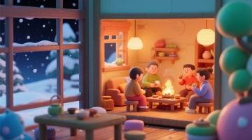 中式庭院融梦幻与温馨,软3D毛发生长风呈现可爱卡通感,雪中红梅与暖灯交织,营造冬日节日氛围。