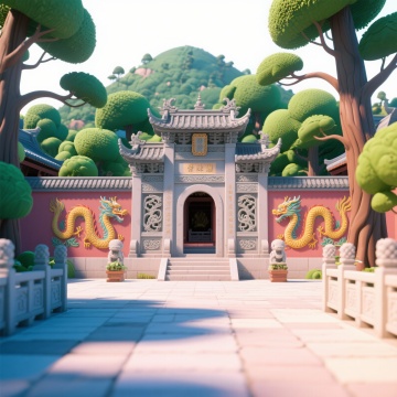 中式古典插画风,清新软3D虚拟自然,红墙古寺隐于青山绿水间。